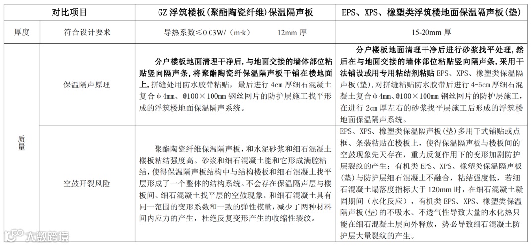 GZ浮筑楼板(聚酯陶瓷纤维)保温隔声板系统与EPS、XPS、橡塑类浮筑楼地面保温隔声系统质量对比