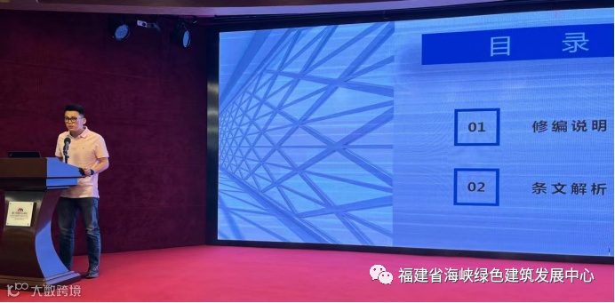 省建科院工程建设事业部副总经理王云新从法律层面和技术层面对《福建省绿色建筑发展条例》进行了释义,帮助培训人员全面领会、准确把握《条例》的内涵实质与相关要求。