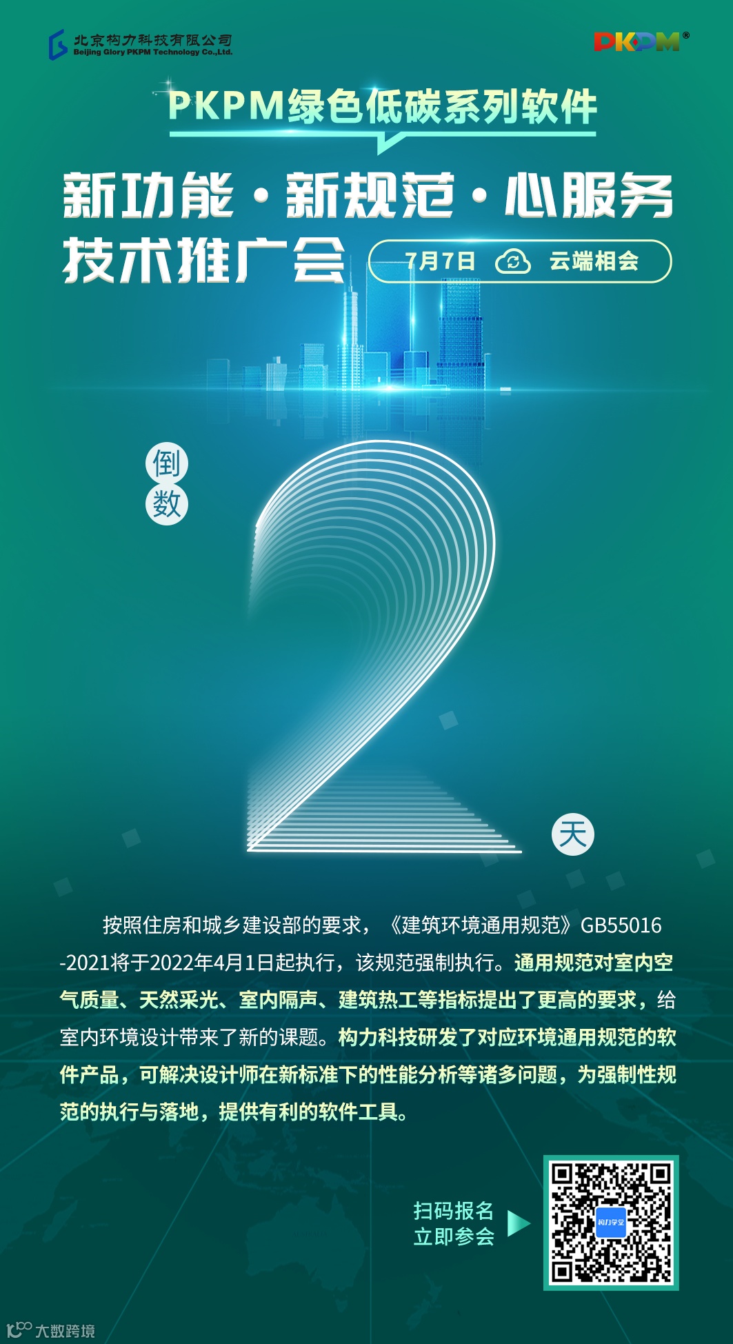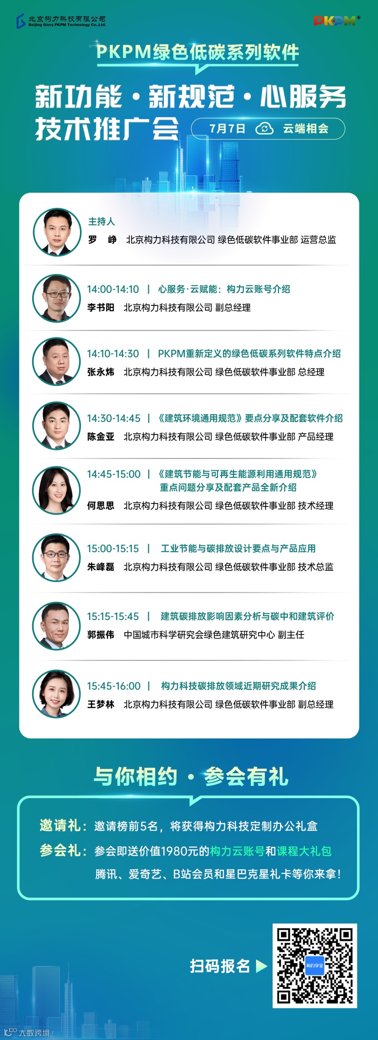 7月7日 14:00 PKPM绿色低碳系列软件新功能·新规范·心服务技术推广会将介绍国家通用规范对于《建筑环境通用规范》设计要点进行分享,帮助各位建筑同仁理解规范要求,助力规范落地。诚邀您的参与!