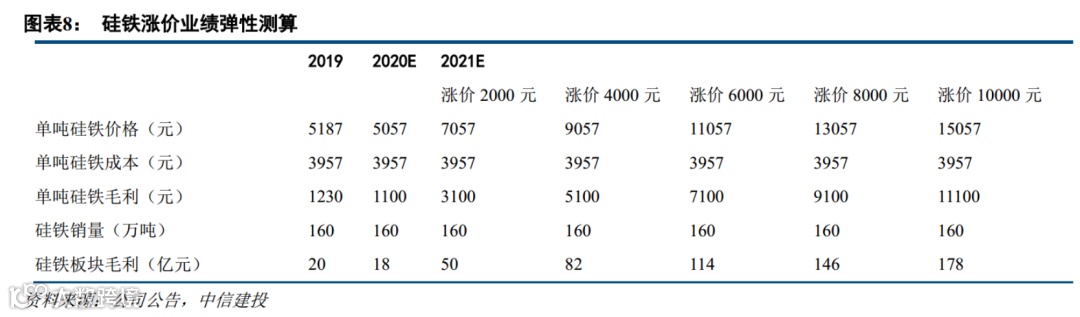 内蒙古十三五的能耗双控效果更差,并且硅铁在钢铁种成本占比更高,因此我们认为相较于山东省控制焦炭产量而言,内蒙控制硅铁产量会更为严格。相关政策一旦得到严格执行,硅铁的价格弹性更甚于焦炭,一旦硅铁产量下降,刚性的下游需求会成为价格上涨的有力支撑。并且硅铁的生产成本相对固定,价格上涨必然加大利润空间。