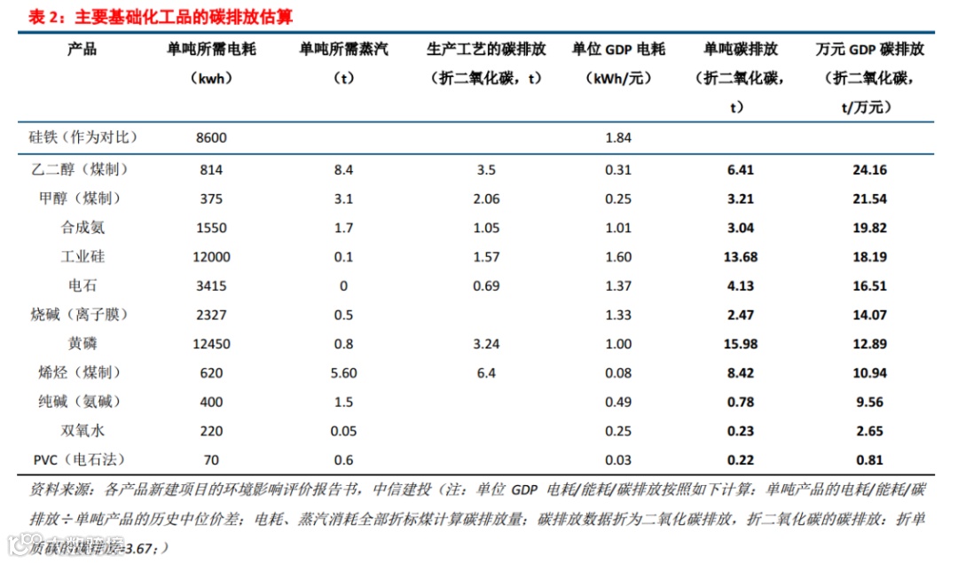 根据计算结果,单位GDP碳排放居于前列的基础化工产品分别是煤制乙二醇、煤制甲醇、合成氨、工业硅、电石、烧碱、黄磷、MTO、纯碱。集中在低附加值的大宗化工品,基本上与电耗高/电力成本占比高的产品相吻合。同时,也与内蒙古给出的禁止新建产能的化工品清单基本吻合。