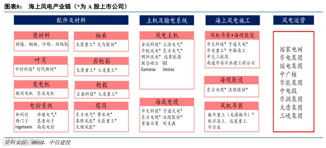 风电产业链:风电行业产业链主要包括原材料企业、零部件制造商、风电整机制造商、风电运营商四大环节。
