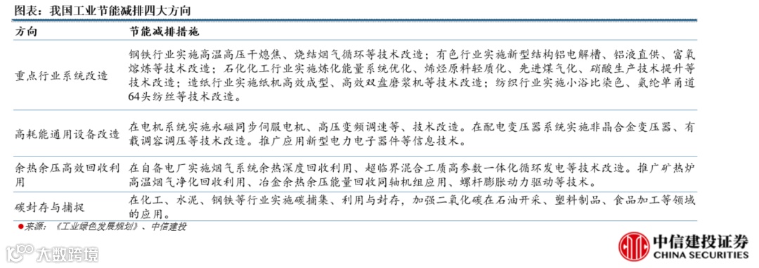 在碳达峰的背景下,我国工业将加快节能减排改造。从具体措施来看,我国工业节能减排主要通过传统工业领域系统改造、高耗能通用设备改造、余热余压高效回收利用、碳封存与捕捉等措施来实现节能减排。