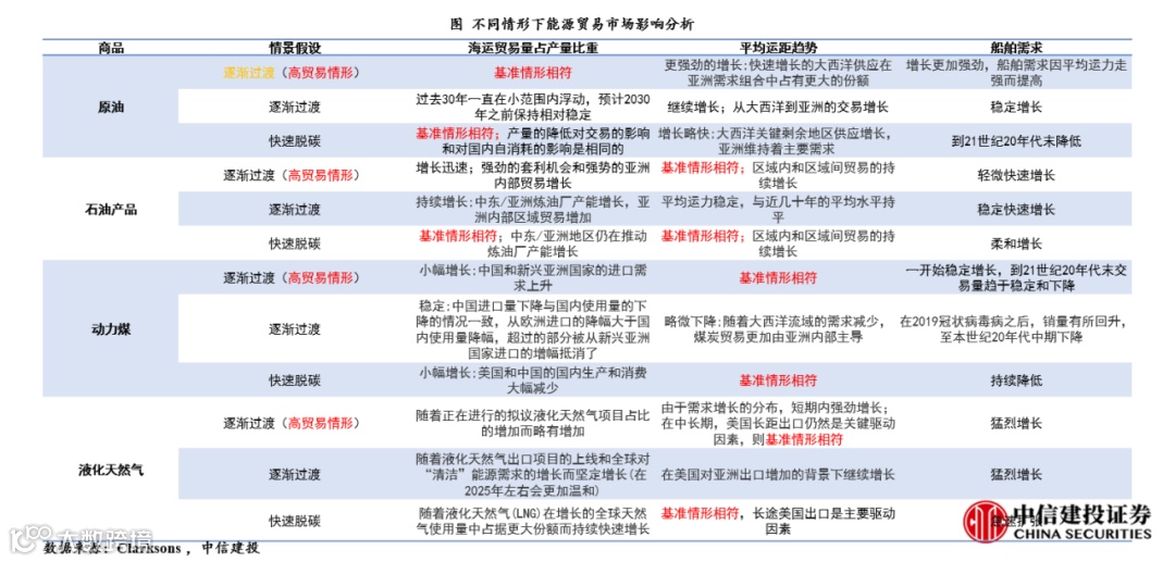2030年原油在快速脱碳背景下,海运贸易量在达到峰值后会逐渐下滑。动力煤在渐变和快速脱碳背景下也会出现下滑趋势。LNG的确定性较好,无论在哪种情景下,海运贸易量都出现大幅度上涨。