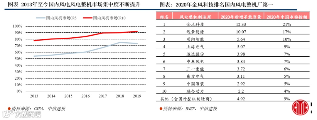 国内风电整机市场(含原材料及零部件)规模超千亿,行业集中度高。从风电场资本开支构成来看,国内风电整机市场(含原材料及零部件)规模超千亿元。风电场资本开支由风电整机、系统平衡(电气基础设施、组装和安装)以及财务费用(保险、建筑融资等)组成,其中陆地风电场资本开支中风电整机投入占比约65-70%,以此推算,国内风电整机市场(含原材料及零部件)规模超千亿元。重点推荐风电整机龙头金风科技。