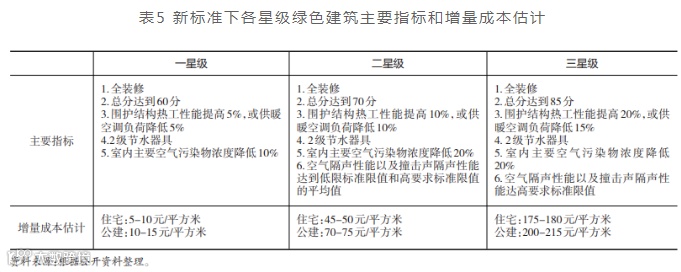 2021年初,住房和城乡建设部印发《绿色建筑标识管理办法》,进一步规范了绿色建筑标识管理,新标准下星级之间的区分认定更加明确,增量成本差异明显(见表5)。