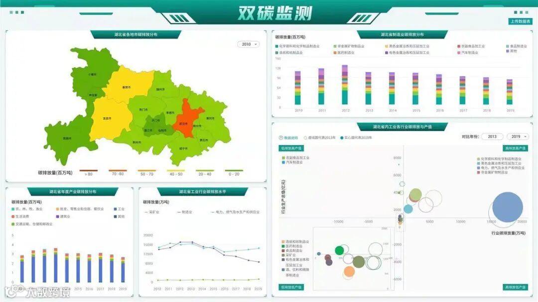 以湖北的“电碳地图”为例,湖北充分发挥数据资源优势,深度融合能源消费数据,打通“电—碳—能”数据链条,建立地市用电量与碳排放联动模型,形成湖北电网14地市电-碳地图,对35个主要碳排放源行业碳排放变化趋势进行可视化分析,实现从电量看碳排放的全景动态展现;将省内重点行业的碳排放量与产值关联,构建产业产值—碳排放四象限评价体系,按照增产降碳、减(稳)产降碳、增产增碳和减产增碳进行归类,为推动各行业低碳转型提供直观、量化的分析工具。