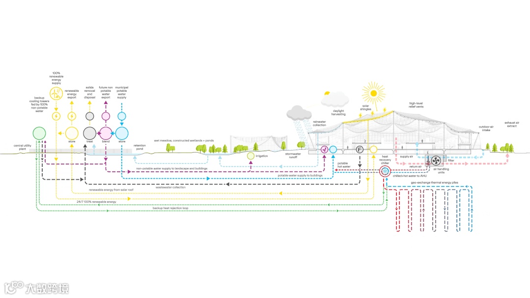 园内还安装了北美最大的地热管网系统。地热管网由管道和闭环地源热泵系统组成。它们可以安装在比地热钻孔更浅的深度。地热管网系统连接到已集成在校园建筑结构中的地热交换场,实现低碳加热和冷却。巨大的地质交换场被整合到结构系统中,将通常用于冷却的水量减少了 90%——这相当于每年 500 万加仑的水。