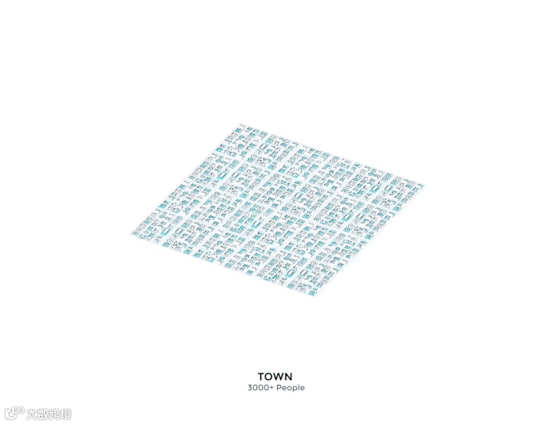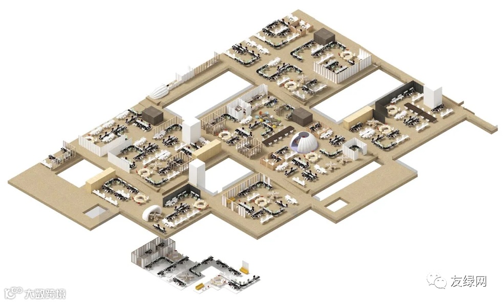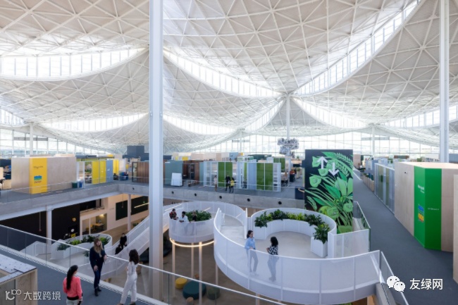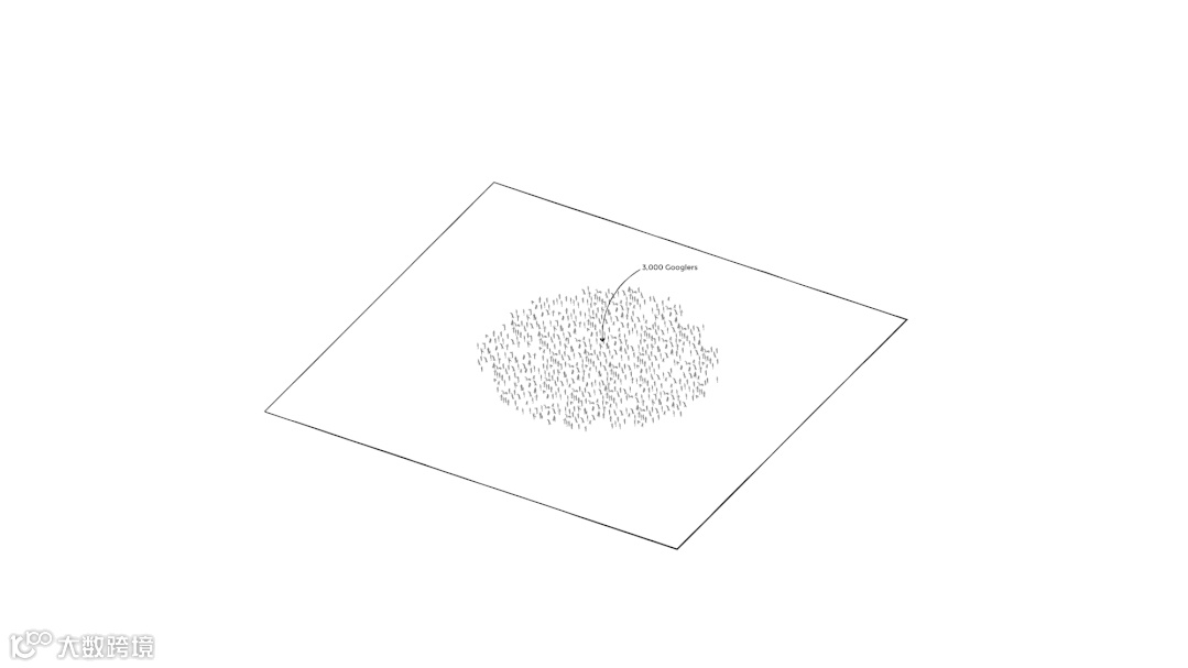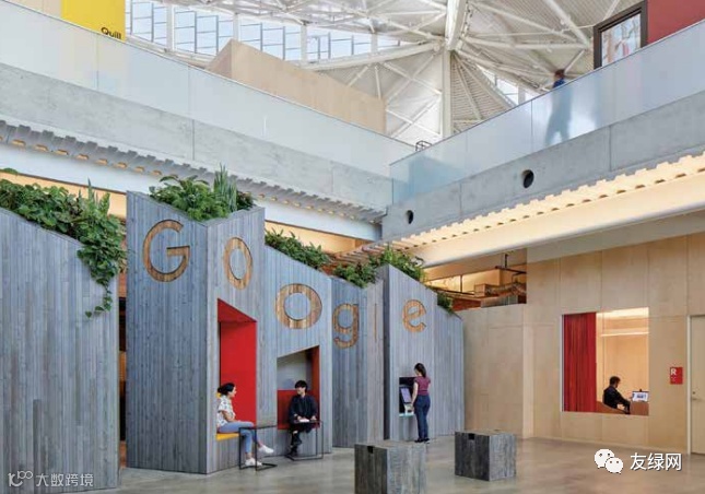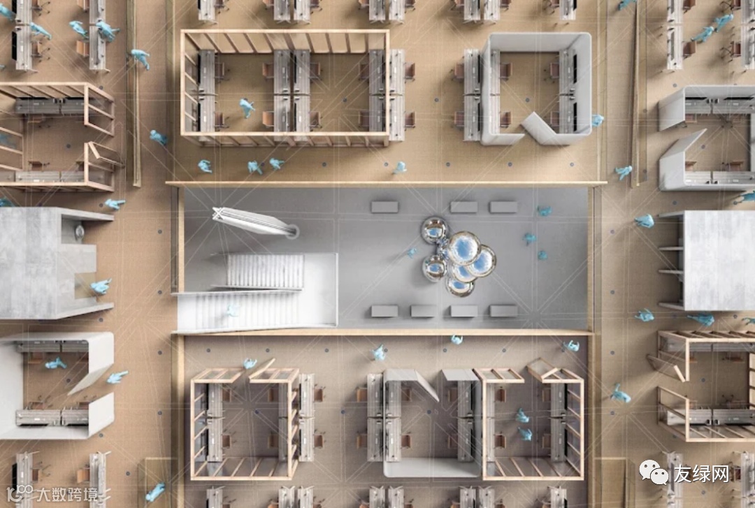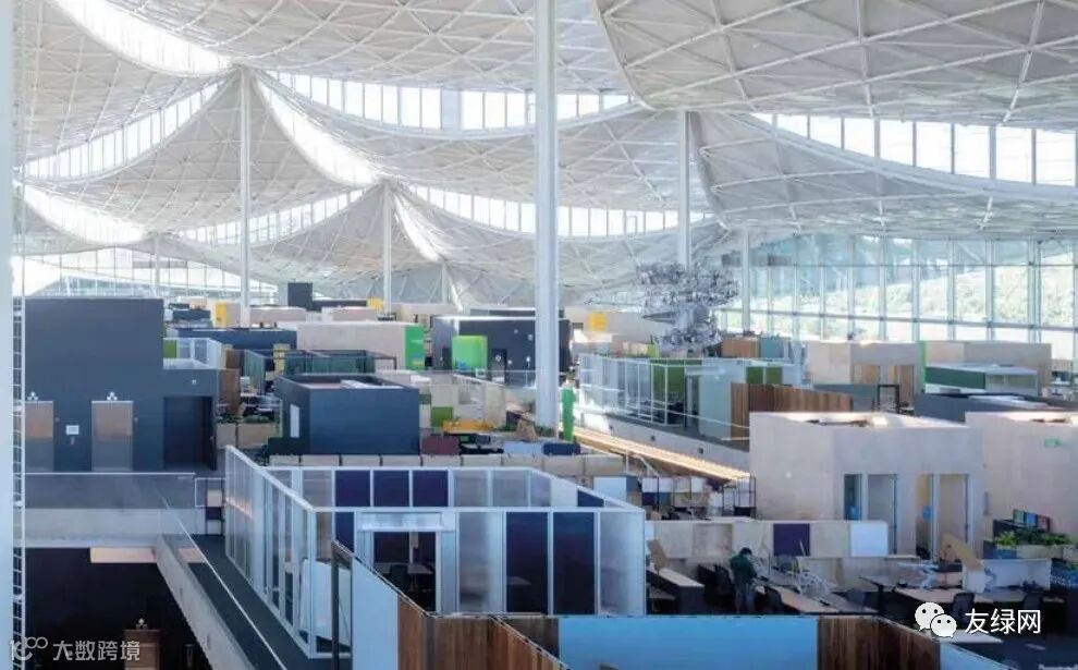 二楼工作区鸟瞰图展示了成千上万谷歌员工如何与各个团队处于互联空间中