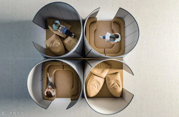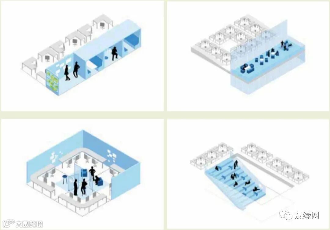 举个例子,比方说某项目团队获得了一块可以容许4个人工作的空间,在项目讨论阶段,需要大量的协作讨论,可以布置成共享空间;讨论完了进入执行阶段,员工写代码需要长时间安静、相对独立、不受打扰的空间,则可以重新布置: