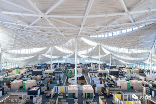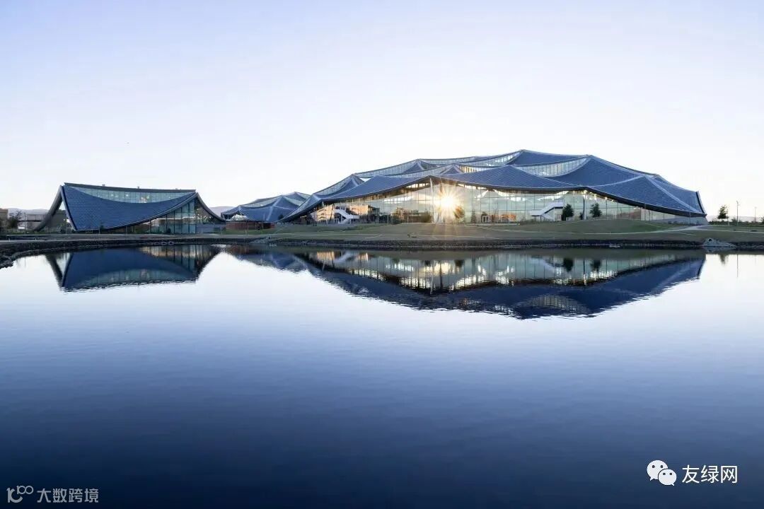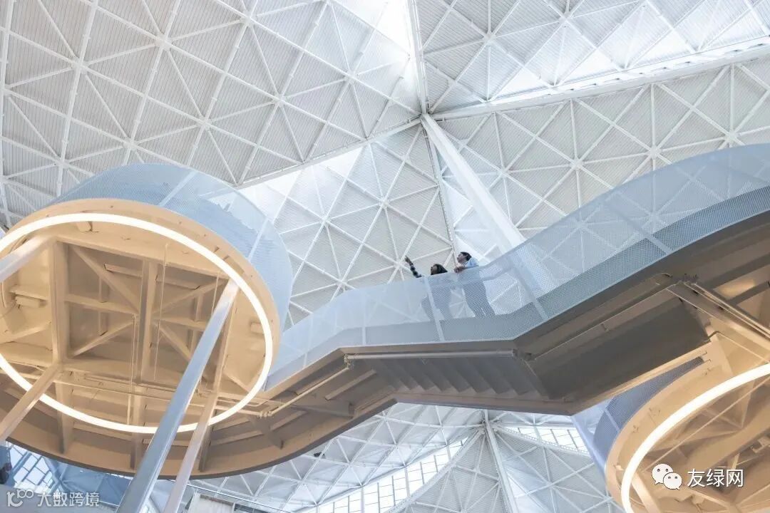 下图显示了主楼的顶棚,其实在“龙鳞”状的光伏板之下,还藏有收集雨水的管道。这些管网能够将水输送到后续的蓄水池,作进一步使用。