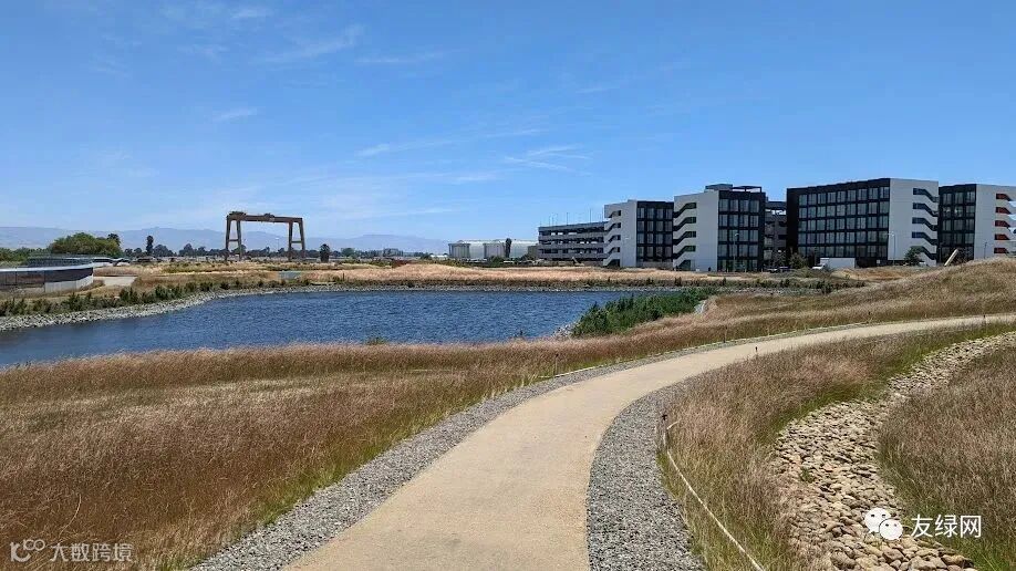 这个小池子不是园林设计,而是一个雨水蓄水池,在整个园区水资源利用和自然水体保护当中扮演了相当重要的角色。在它的背后,谷歌还规划了一片能够释放多余水量的生态保护区域,不作为办公使用。