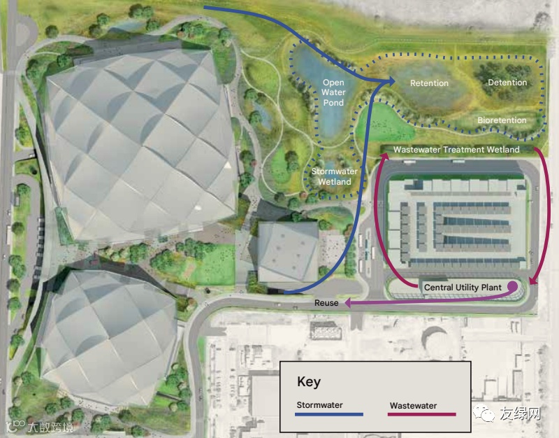 关于雨水收集,谷歌表示,园区将只使用它在现场收集和循环利用的水,来满足所有的用水需求。园区内设有一系列收集雨水的池塘以及自己的废水处理系统。事实上,该园区的目标是“亲水利用”——它回收的建筑废水,加上收集的雨水,应该超过它的用水量。