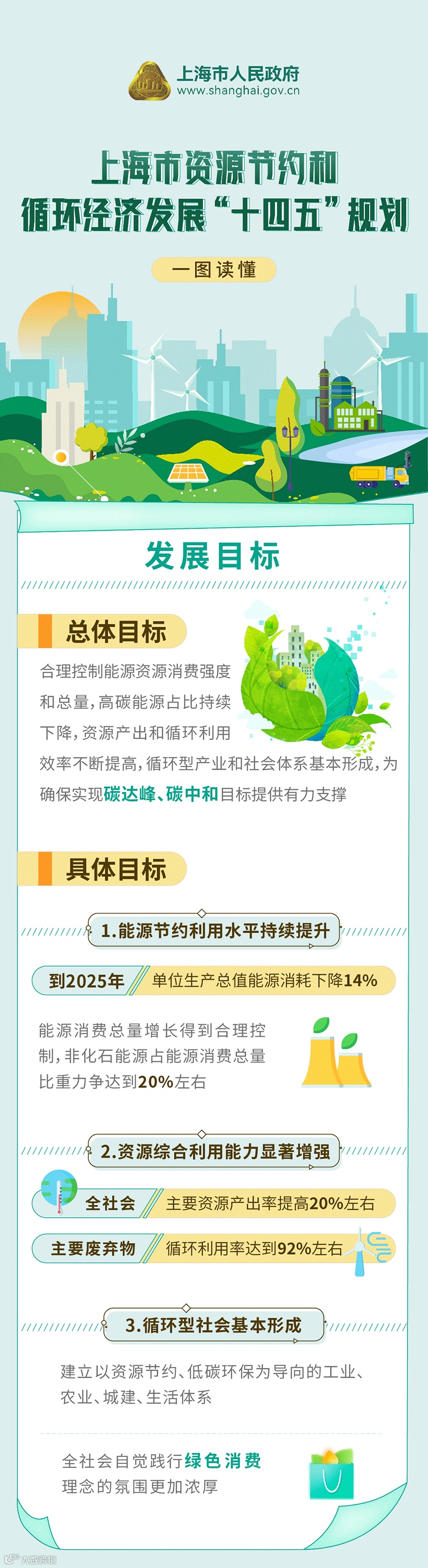 为进一步推动本市资源节约和循环经济发展,近日,根据《上海市国民经济和社会发展第十四个五年规划和二〇三五年远景目标纲要》,市政府办公厅印发了《上海市资源节约和循环经济发展“十四五”规划》。