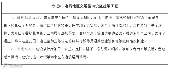 服务沿边城镇体系建设,以公路、机场为重点,大力改善边境地区交通出行条件,提升边境城镇人口集聚能力。统筹推进边境地区国省干线公路、农村公路等建设,全面完善国道干线主骨架,推进沿边公路并行线建设和低等级公路提质改造,加快抵边公路建设,尽快形成层次清晰、结构合理的沿边公路网。稳步推进边境地区机场建设,构建多层级航空网,扩大航空运输服务覆盖面。补强同江、二连浩特、阿拉山口、霍尔果斯、瑞丽、磨憨等口岸后方铁路通道能力。加强抵边自然村邮政设施建设,实现邮政服务普遍覆盖。