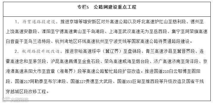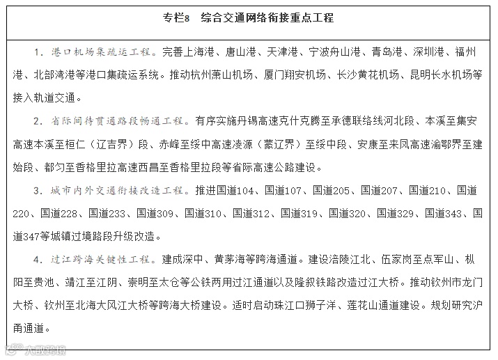 加快解决制约人民美好出行、货物高效流通的瓶颈,强化综合交通网络有机衔接。打通公路省际待贯通路段,加强干线公路与城市道路有效衔接,推进城镇密集地区干线公路过境段、进出城瓶颈路段升级改造。加强枢纽机场与轨道交通高效衔接,使换乘更加便捷。强化进港区、进园区、进厂区、进规模化农产品基地等集疏运设施建设,加快推动铁路进港口重点港区和大型工矿企业、物流园区、重点物资储备库。统筹考虑资源高效利用、生态环境保护和防洪航运安全,有序建设各种运输方式共享通道资源的过江跨海通道。推动超大特大城市的大型综合客运枢纽间通过轨道交通互连。加快实现联系紧密的综合货运枢纽间通过联络线或专用通道互连。