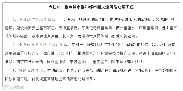 强化重点城市群城际交通建设。围绕京津冀、长三角、粤港澳大湾区、成渝、长江中游等城市群,以轨道交通、高速公路为骨干,提升城际运输通道功能,加强核心城市快速直连,构建多节点、网络化的城际交通网,实现城市群内主要城市间2小时通达。整体推进京津冀、长三角、粤港澳大湾区城际铁路和市域(郊)铁路建设,有序推动成渝地区双城经济圈城际铁路和市域(郊)铁路建设,加强与高速铁路、普速铁路一体衔接,扩大对5万人口以上城镇的有效覆盖。