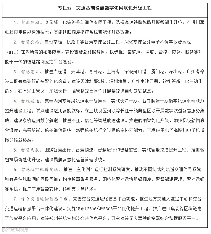 整合优化综合交通运输信息平台。完善综合交通运输信息平台监管服务功能,推动在具备条件地区建设自动驾驶监管平台。建设基于区块链技术的全球航运服务网络。优化整合民航数据信息平台。提升物流信息平台运力整合能力,加强智慧云供应链管理和智慧物流大数据应用,精准匹配供给需求。有序建设城市交通智慧管理平台,加强城市交通精细化管理。