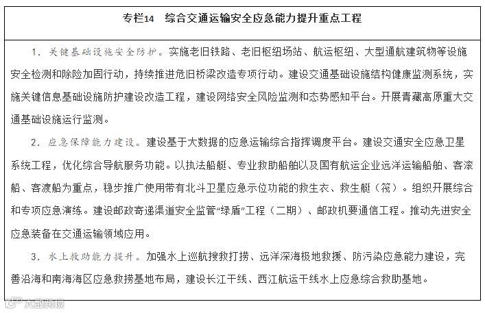 健全综合交通运输应急管理体制机制,完善应急协调机制和应急预案体系,加强交通运输调度与应急指挥平台建设。推进区域性公路应急装备物资储备中心建设。加强水上交通安全监管、航海保障和救助打捞能力建设,完善沿海和内河溢油应急设备库,构建陆海空天一体化水上交通运输安全保障体系。建设城市轨道交通应急演练中心。以骨干航空物流企业为主体构建航空应急服务网络。建设海事监管指挥系统。在开展城市交通基础设施地下空间、低洼区域、重点区段、重要点位、关键设施等隐患排查基础上,建立健全风险台账和灾害隐患清单,补齐设施设备、应急抢险物资等短板,持续完善应急处置预案,健全应急响应机制,提升应对极端天气能力。加强应急专业队伍和志愿者队伍建设,充实国家应急运输储备力量。健全应对重大疫情、防范应对恐怖袭击、保障信息安全等非传统安全应急指挥体系和应急交通组织。