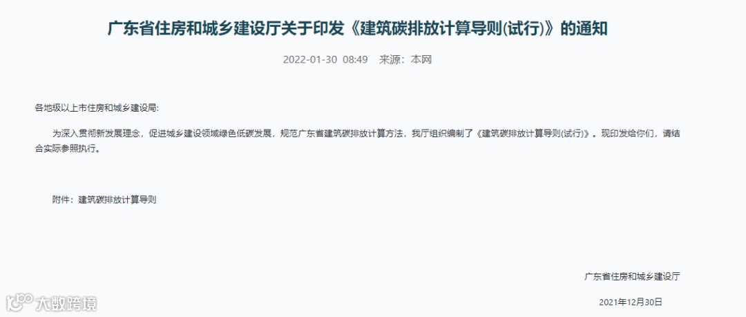 近日广东省住房和城乡建设厅发布了《建筑碳排放计算导则(试行)》的通知。该导则按照建筑领域碳排放计算边界,给出了建造、运行、拆除三个阶段的碳排放核算方法,可用于已建成建筑的碳排放计算,也可用于设计阶段的建筑碳排放估算。