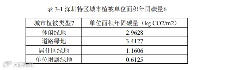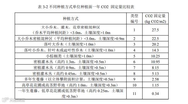 第二层次,对于具体绿化大致构成的核算,也可采用不同植物的固碳能力,参考附录 3 中的表 3-2。