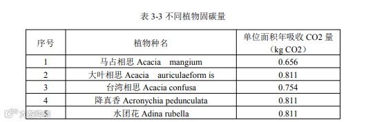 第三层次,精细核算,根据植物种类和数量,逐一核算绿化碳汇, 具体植物的固碳能力见附录 3 中的表 3-3。(截图为部分)