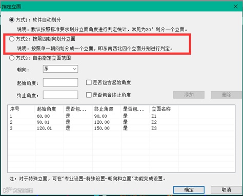 若想要一个朝向划分一个立面进行判定,则需要在软件中设定朝向划分角度。方式为,点击左侧菜单栏中的“标准参数”——“立面角度”——选择第二种方式。不修改情况下,软件按照“方式一”进行划分立面。