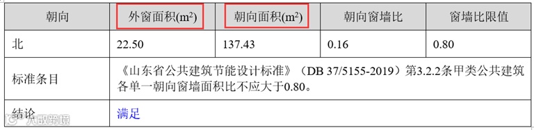 如《山东省公共建筑节能设计标准》(DB 37/5155-2019)判定朝向窗墙比。下图为其节能报告书判定表格,以西向为例。