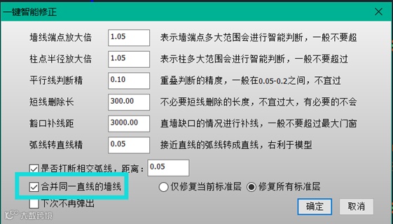 处理办法:可手动调整,也可以使用V3修复进行全楼合并。在弹出的修正框里面勾选“合并同一直线的墙体”。