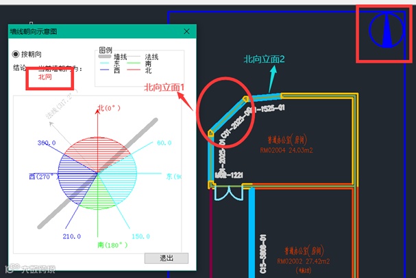 (1)朝向的判断:有角度的墙体需要首先判定其角度所在朝向范围