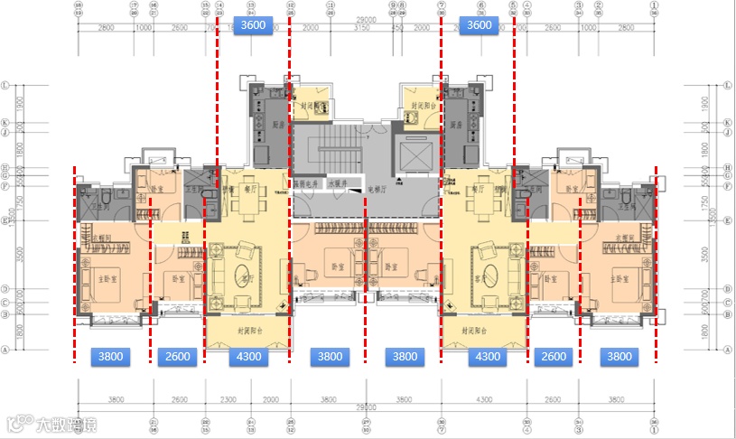 本项目平面设计采用左右对称的一梯两户,南北向主要为卧室、起居室、餐厅开间执行1M,楼梯执行模数协调原则,楼梯间梯段采用预制构件。平面布局如下图1。