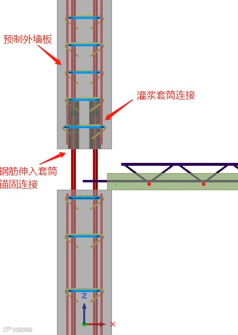 本工程外墙板采用不带外叶的墙板型式。内外墙板水平板缝采用套筒连接——预制墙板顶部受力钢筋外露,墙底预留套筒,墙板安装完毕后灌注高强无收缩灌浆料填实,将预制墙板竖向预留钢筋与预埋套筒和结构缝隙连接成一个整体,设计中对剪力墙水平接缝进行受剪承载力验算。屋顶层预制剪力墙顶部设置封闭混凝土后浇圈梁,增强结构整体性。墙体水平后浇带及模型深化节点如下图3、图4所示。剪力墙体竖向接缝参照图集构造,如下图5-7。