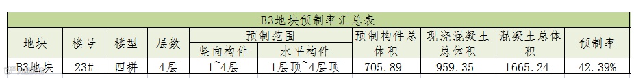 该项目单体预制率计算汇总表如下表1,单体预制率达42.39%,满足北京市【2017】8号《关于加快发展本市装配式建筑的实施意见》文件的规定。