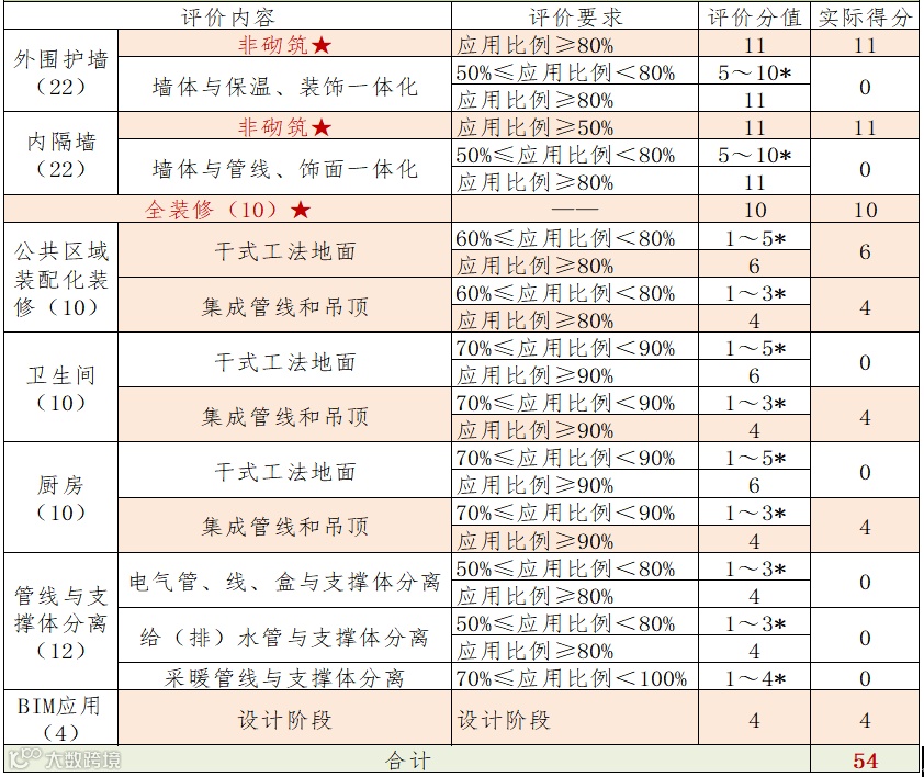 本项目外墙非承重部分选用B05级蒸压加气混凝土条板及砌块(局部)。内隔墙部分,核心筒内楼电梯围合墙体、内嵌设备处墙体以及部分不适合采用条板墙施工的位置,选用砌筑墙体;其余部分均采用B05级蒸压加气轻质混凝土条板墙。依据《北京市发展装配式建筑2018-2019年工作要点》(京装配联办发〔2019〕1号)中装配式建筑装配率评分表进行判定,装配率54%满足相应要求。