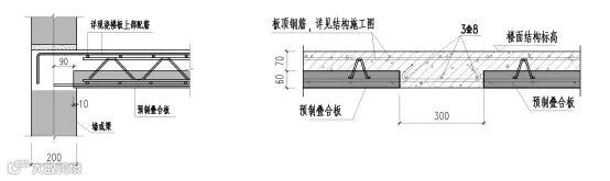 本项目除前室等公共区域以及户内不适合预制的部分,其它部分均采用预制混凝土叠合楼板。叠合楼板由下部预制混凝土底板和上部叠合层组成,预制板厚度最薄为60mm,现浇层厚度最小为70mm;预制板表面做成凹凸差不小于4mm的粗糙面、内设置桁架钢筋,以增加预制板的整体刚度和水平界面抗剪性能。叠合板主要连接节点如下图8所示。