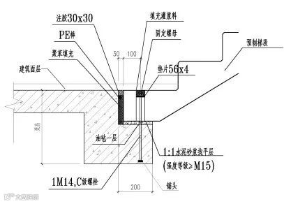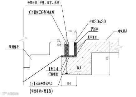 本项目中水平构件除叠合板外,楼梯与空调板也采用预制,楼梯采用一端固定一端滑动,均采用构造做法,连接节点如下图9-10所示。空调板采用全预制式,锚固端伸入支座,并满足锚固要求。