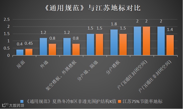 图七:《通用规范》(夏热冬冷B区)与江苏地标(夏热冬冷6层及以上分散)非透光围护结构限值对比