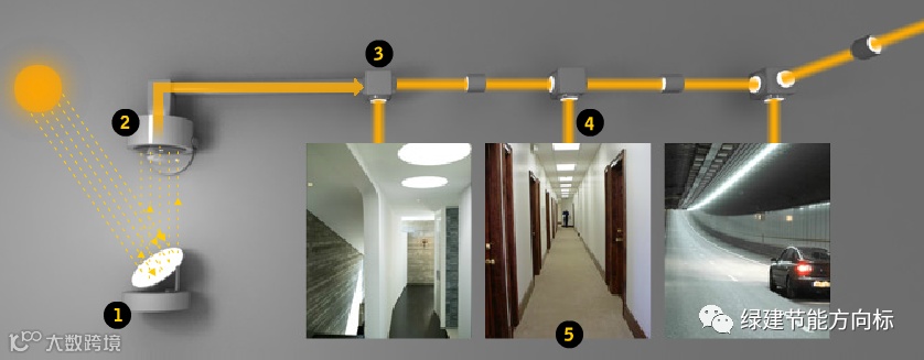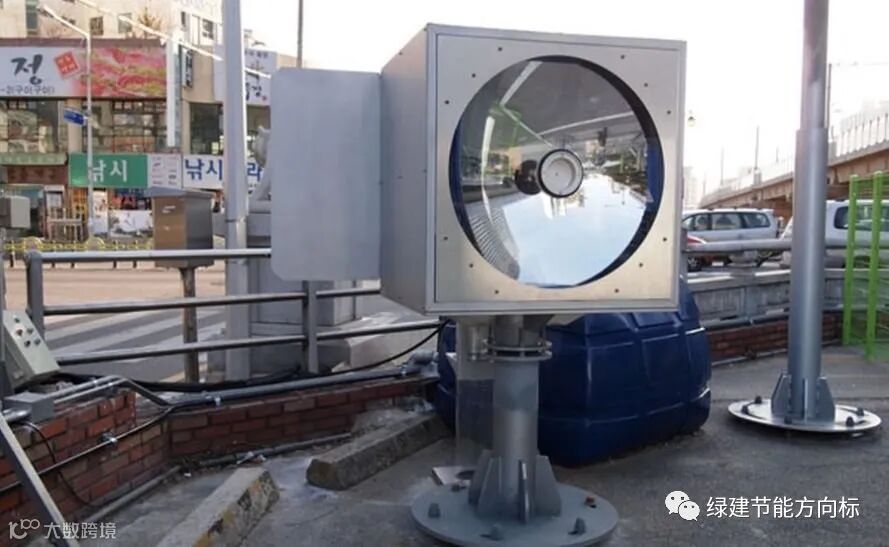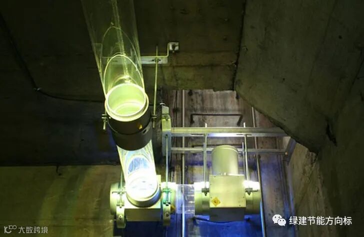 采集器将光线重新定向到“超阳光聚光器”中,该聚光器将光线导入一个小光管的光圈中。