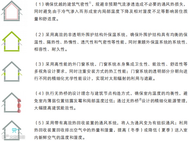 被动式低能耗建筑是指,适应气候特征和场地条件,采用高效的围护结构保温系统、高性能的外门窗系统、良好的建筑气密性系统、无热桥的建筑节点构造、高效热回收的通风系统,以及自然通风、自然采光、太阳辐射利用与遮蔽等被动式节能技术,大幅度降低建筑本体的能源需求,进而通过优化能源供应方案、提升能源利用效率,同时满足室内环境热舒适性和建筑能效性要求的建筑。