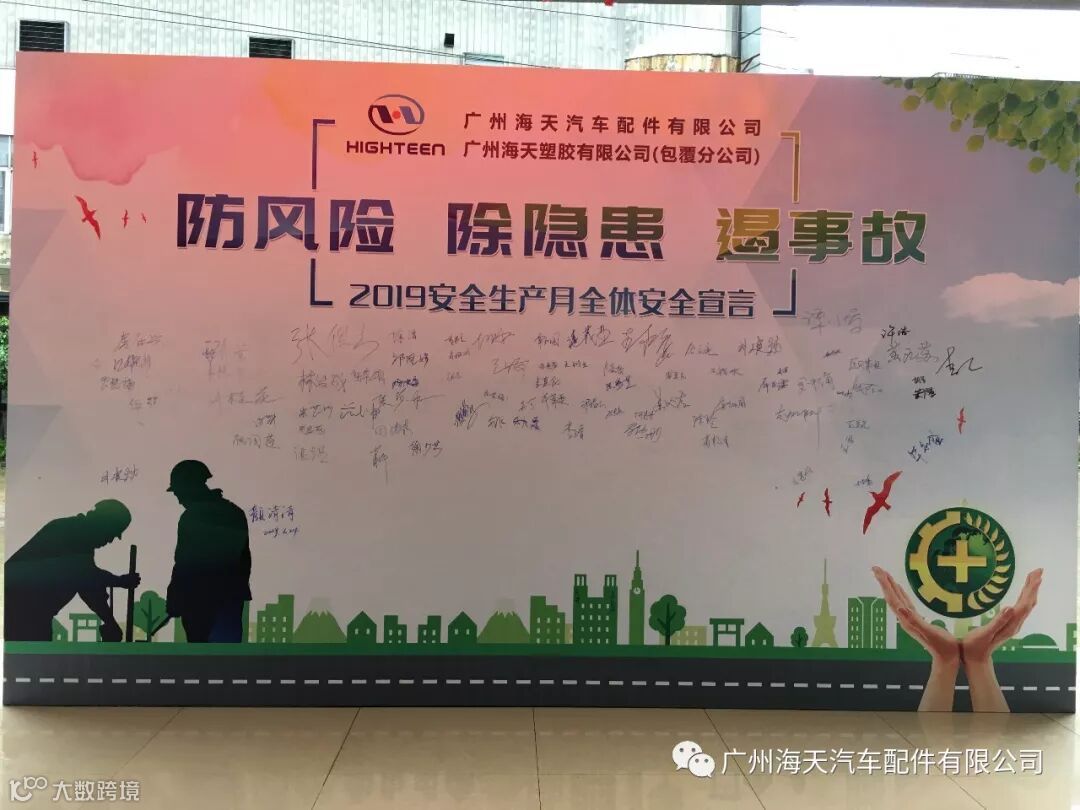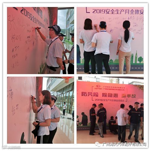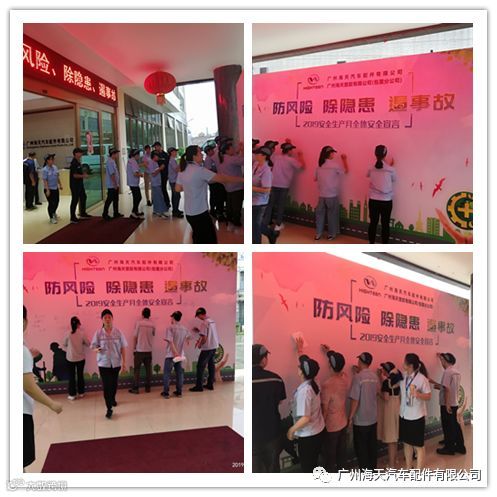 2019年6月份,国家第18个生产安全月,海天在公司总经理刘董、罗总的指示下,在工厂长范坤先生和总部人力资源部中心张总监的指导下,对社内展开“防风险、除隐患、遏事故“等一系列的安全宣导活动。包括:安全培训、横幅宣导、签定《生产安全责任书》等等一系列的安全宣导活动。