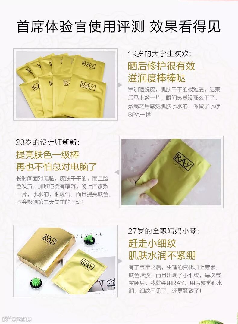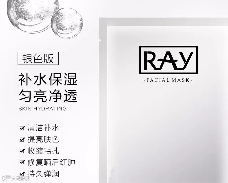 ray面膜~泰国风靡的面膜,首先面膜是蚕丝体,精华稠且多,敷完第二天皮肤有紧致q弹的感觉,是紧致不是紧绷喔,保湿度很好,而且一片面膜使用后效果至少保持三天,脸摸起来相当爽。解决6大肌肤问题:敏感,毛孔粗大,干燥暗黄,暗沉,痘疤痘印,斑点,紧致美白保湿效果绝对赞 紧致补水 美白 收缩毛孔。