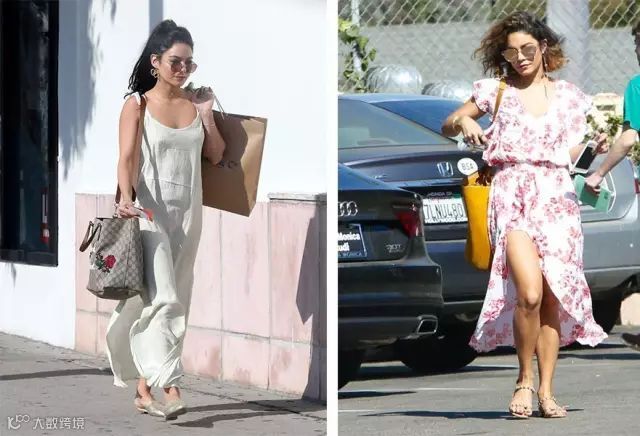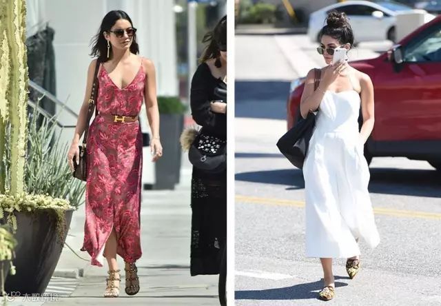 这种设计的长裙是对小个子不够友好的,还是拿Vanessa举例吧(因为她真的很爱长裙..),同样是吊带款的长裙,左边下垂的裙摆就比右边的膨胀感裙摆要显高啊。