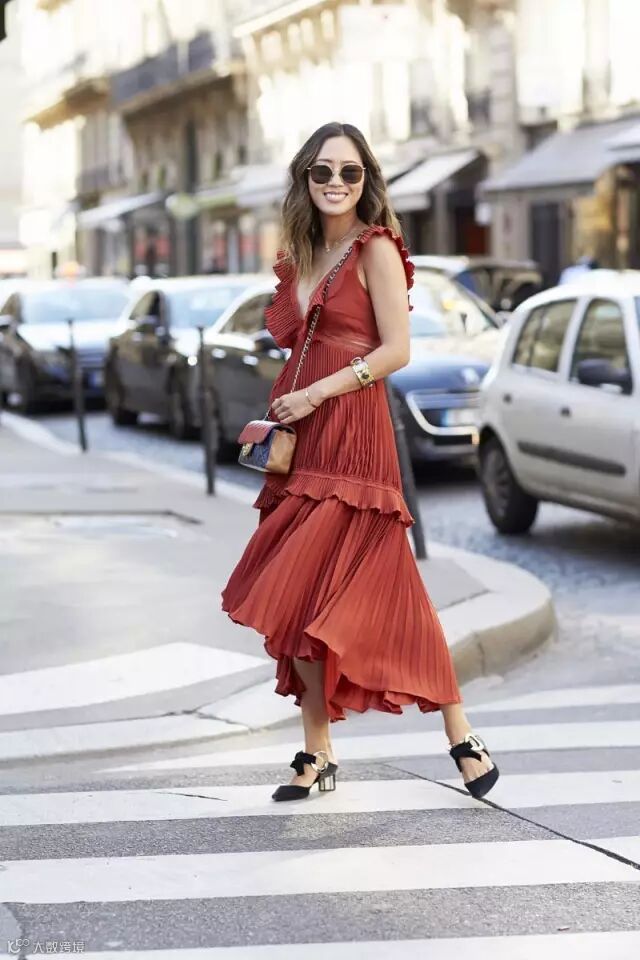 不过对于普通人,建议还是不要太拼了,尤其是一些轻薄的面料,风吹起的时候也是蛮尴尬的。一般开衩不要超过大腿中部以上还是安全些。