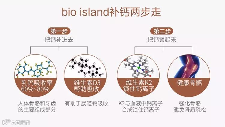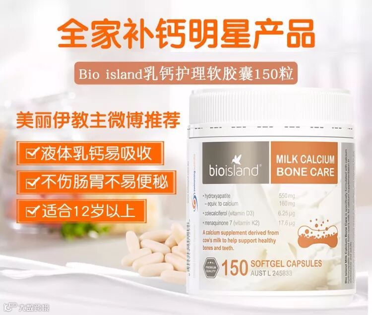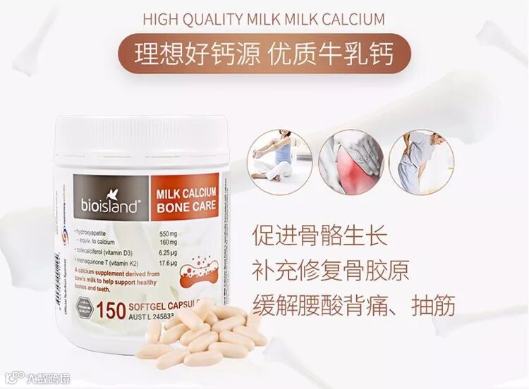 ☆Bioisland乳钙骨护理胶囊含有的维生素D3能提高促进体内钙的吸收,有效减少因饮食中缺乏钙及钙不能有效吸收所导致骨质疏松。每粒胶囊含有维生素K2将补充和吸收的钙质与人体骨骼中本身含有的钙充分结合提高骨密度,强大支持锁住补充的钙质,避免钙质的流失。