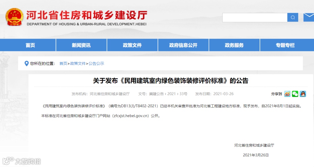 《民用建筑室内绿色装饰装修评价标准》(编号为DB13(J)/T8402-2021)已经本机关审查并批准为河北省工程建设地方标准,现予发布,自2021年8月1日起实施。