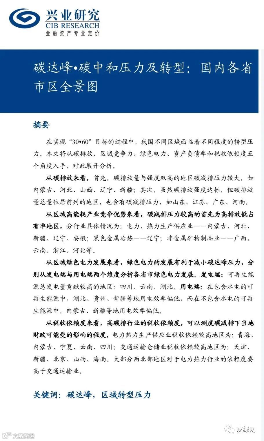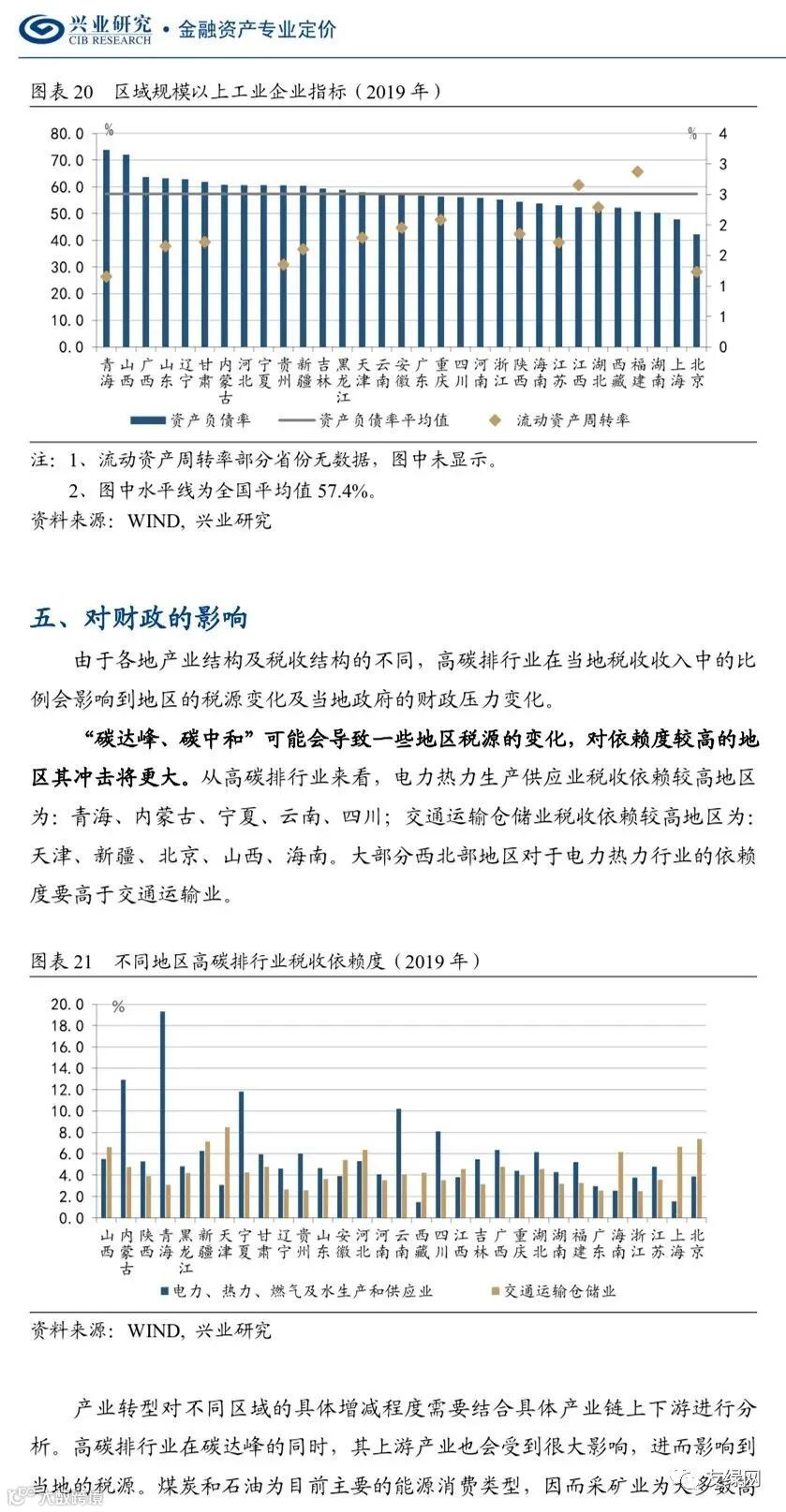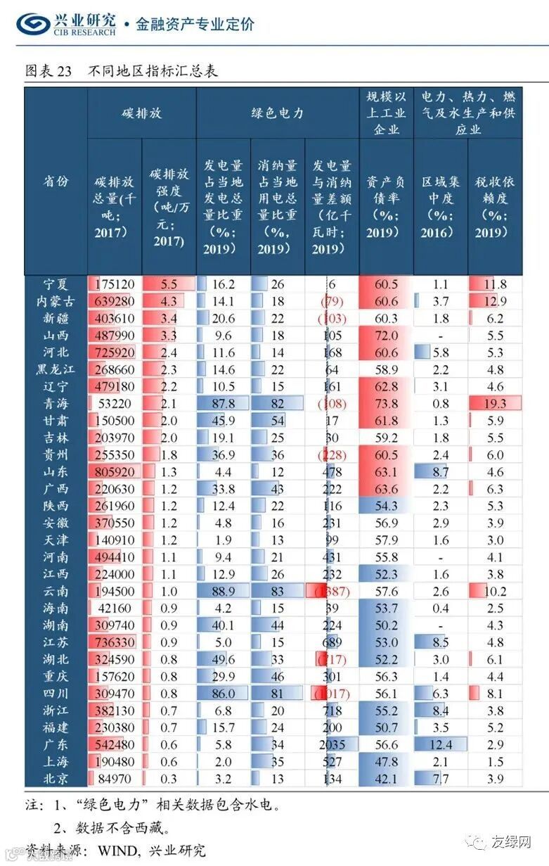 提出要做好碳达峰、碳中和工作。兴业研究从碳排放、区域竞争力、绿色电力、资产负债率和税收依赖度五个