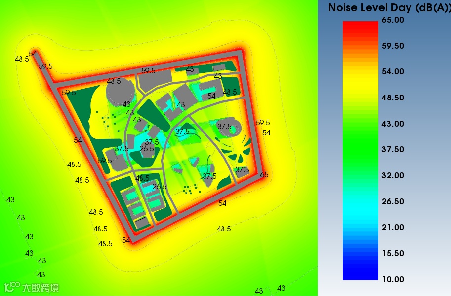 V3.2室外声环境模拟软件采用全新方式渲染平面噪声图、立面噪声图,新增调整色卡上下限的功能,增加区间色、过渡色、等值线等显示,增强可视化效果。