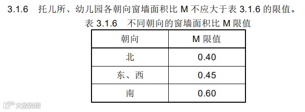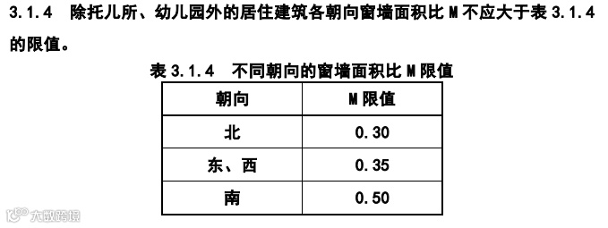 3.居住建筑各朝向窗墙面积比M不应大于表3.1.4和表3.1.6的限值。