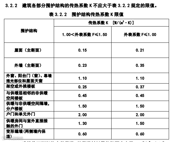 1.建筑各部分围护结构的传热系数 K 不应大于表 3.2.2 规定的限值。