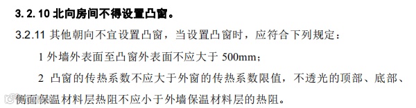 5.北向房间不得设置凸窗。其他朝向不宜设置凸窗,当设置凸窗时凸出距离不应大于500mm。